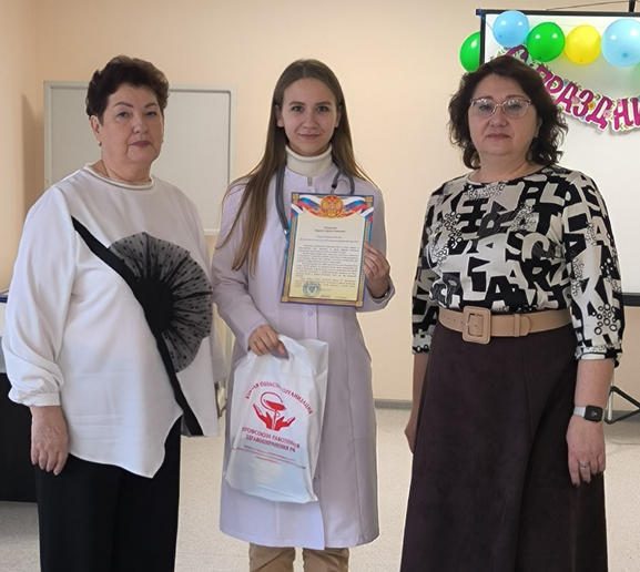 Не обошлось и без сюрпризов. Каждому начинающему свой путь в медицине, председатель первичной профсоюзной организации Людмила Клемешова вручила памятный подарок.